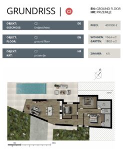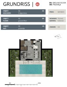| Lakás | Szobaszám | Lakóterület (m²) | Kert (m²) | Ár (€) |